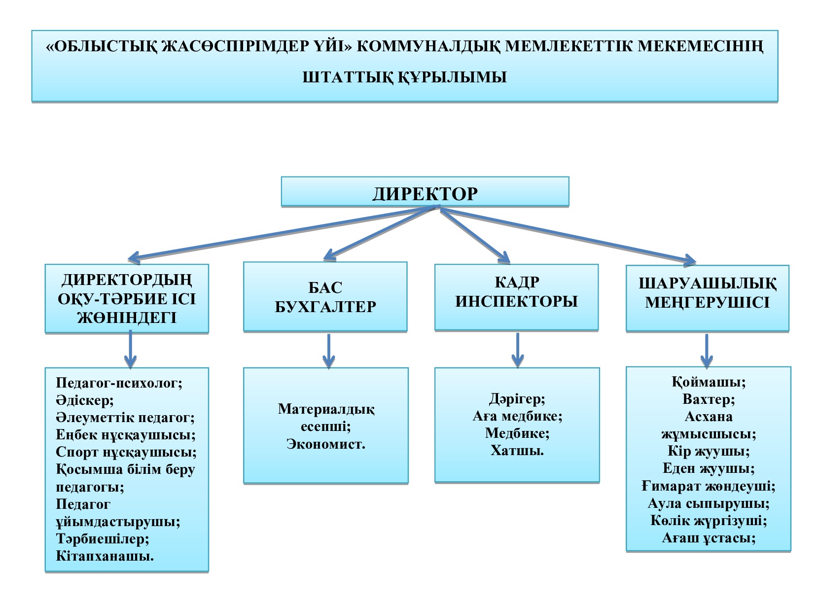 Директор, директордың орынбасары Кадр инспекторы, хатшы Әдіскер, педагог-психолог, әлеуметтік педагог, кітапханашы Бас есепші, экономист, материалдық есепші Шаруашылық меңгерушісі, слесарь-сантехник Дәрігер, аға медбике, медбике, ҚҚБ педагогы Ұйымдастырушы педагог, еңбек нұсқаушысы, спорт нұсқаушысы, Тәрбиешілер, қоймашы, асхана жұмысшысы, вахтер, аула сыпырушы Кір жуушы, көлік жүргізуші, ғимарат жөндеуші Ағаш ұстасы, еден жуушы, аула сыпырушы, күзетші |
