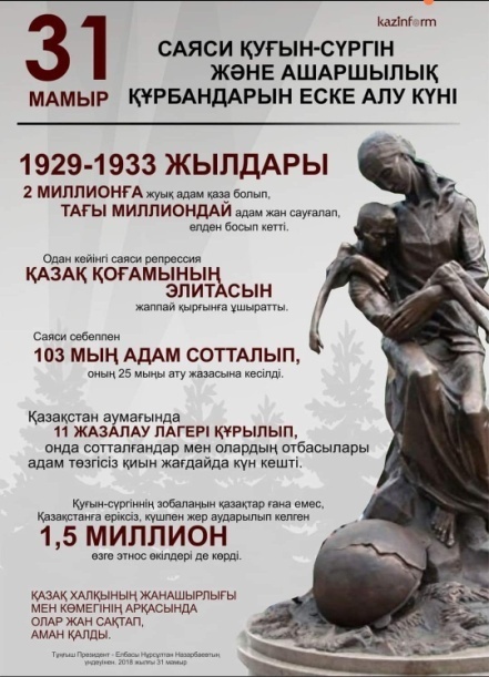 31 мамыр - Саяси қуғын-сүргін құрбандарын еске алу күні. Бұл жылдар қазақ халқының тарихы қойнауында естен кетпес зұлмат кезеңдер болып жадымызда қала бермек. Бұл тарихи кезеңді естен шығару әсте мүмкін емес. Себебі жазықсыз жазаланған, солақай саясаттың салдарынан құрбан болған қазақ зиялыларының қиындық көріп, мерт болған заманы.