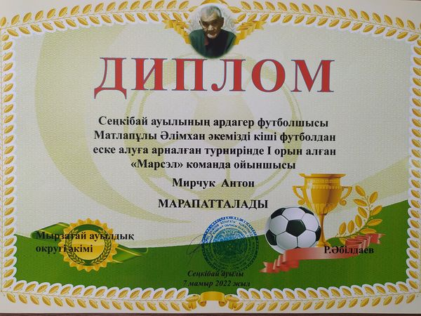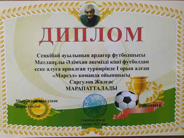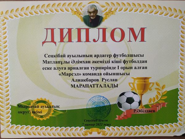 - 7 мамыр 2022 жылы Байзақ ауданы, Мырзатай ауылдық округі әкімдігінің ұйымдастыруымен Сеңкібай ауылында өткен Сеңкібай ауылының ардагер футболшысы Әлімхан Матлапұлының кіші футболдан еске алуға арналған турнирінде 22 команданың арасынан жүзден жүйрік болған, мекеме тәрбиеленушілерінен құралған "Марсэль" футбол командасы спорт нұсқаушысы Д.Амандосовтың жетекшілігімен жүлделі І орынды иеленді.